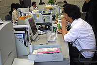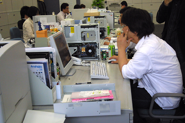 そんなわけで,4月8日に早速HUEにお邪魔して,平田氏の説明を交えてGEを見せてもらった。 訪れたのは,開所式から2か月ほどが経過した東京は秋葉原のHUE事務所。室内はまだ真新しい壁紙の匂いが漂っていて,そこにGM(となるかも知れない人達)を含めた20名弱のスタッフがせっせと業務をこなしていた。静かだったのが意外だが,あちこちにケースを外されて中身が剥き出しになったPCがあったりと,ローカライズとテストによる社内の慌(あわただ)しさがひしひしと感じ取れた。やはりローカライズに関してはかなり苦戦しているとのことで,参考書を山のように用意しつつ,翻訳専門チームとは別にスタッフを総動員して,オリジナルの意味や表現を損なわない翻訳を目指しているとのことだ。