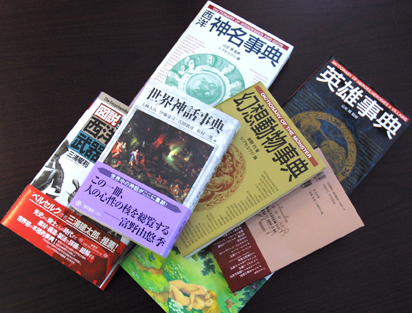 ローカライズの話をしたところで,本棚からごろごろ出てきた資料の数々。スキル名に関して平田氏は「(選択式の)公募という手もありですね」と漏らしていたが……