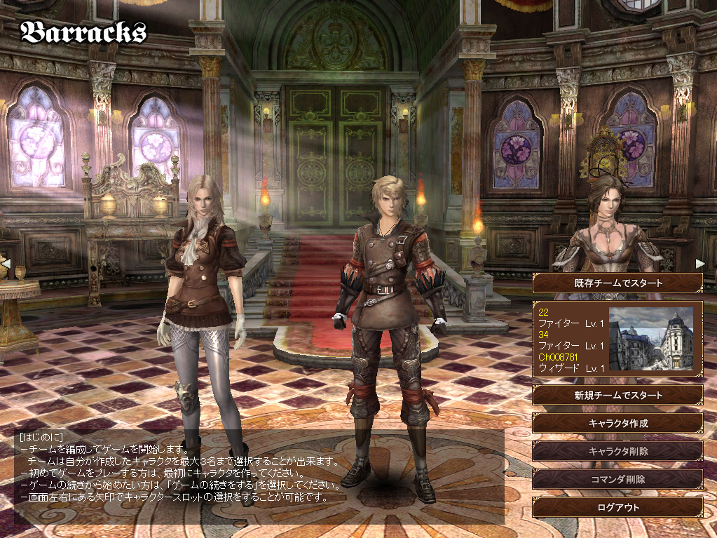 さて全体の印象はともかく,氏がまず見せてくれたのは,プレイヤー(コマンダー)が,作ったキャラクター達を格納しておく「バラック」だ(固有名詞については,「こちら」の韓国版リリース和訳記事に詳しい)。 ドラゴンクエストシリーズで言うところの"馬車"に相当するこの画面では,プレイヤーが作成し育てたキャラクターが9体格納できるようになっていた。韓国での最新プレスリリースには12体と記述されていたが,現時点では9体。平田氏によると,キャラクター数に関しては本国でも仕様を揉んでいる最中とのことだ。 この場面,早い話が(ただの)キャラクター選択画面だが,個々のキャラクターが,イスに腰掛けて談笑したりモデル立ちしたりと思い思いに行動しており,決してシステマチックに徹して冷えた表現のモードになっていない。こうした演出の積み重ねが,本作の世界観を確固たるものにしていると感じられる部分である。