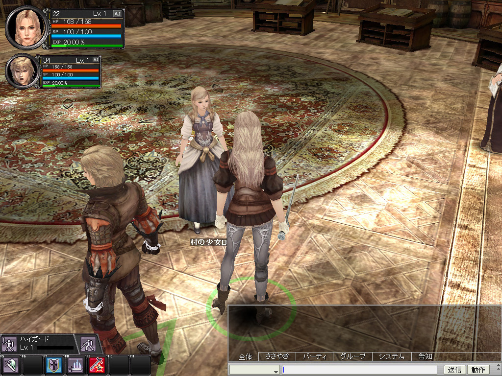 画面インタフェースについては未確定の要素が満載なはずなので,見られた事実だけを淡々とお伝えしよう。ぜひ画面写真と見比べてみてほしい。 メイン画面は,左上にキャラクターアイコンとそれぞれのHP(ヒットポイント)/SP(スキルポイント?)/EXP(経験値),左下にスタンスアイコンとスキルショートカットスロット七つ,右下にチャットウィンドウという感じ。チャットウィンドウのメニューは,全体/ささやき/パーティ/グループ/システムといったオーソドックスなもので,汎用的なチャットコンポーネントのような印象を受ける。 キャラクターのステータスは,STR/AGI/CON/DEX/INT/CHAの6種類(CONは,ファイターで数値が高かったので,おそらくConstitution:耐久力)。戦闘時のダメージ値は大きく丸文字の数字がポップアップする形の韓国産ゲームらしい仕様だ。ただこの辺りは,シリアスタッチを基本路線とする本作の雰囲気を壊す可能性があるので,改善を強く要望したい点である。