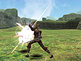 そして何より特筆すべきは,そういったオブジェクトを描き出しいるグラフィックスエンジンの"軽快さ"だ。 この日デモに使用されたPCのスペックは,CPUがPentium4/3.6GHz,メモリ1GB,グラフィックスチップはGeForce 6600。まだまだ未完成のプログラムのためゲームの動作もギクシャクするだろうと覚悟していたのだが,戦闘中でさえ,処理がもたつくことはほとんどなかった。GEオリジナルグラフィックスエンジンの開発にはかなりの年月を割いているし,おそらく動的LoD(Level of Detail)などの,ちょっとした"小細工"を総動員して,この軽さを実現しているのだろう。