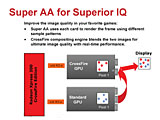 詳細は改めて解説したいと思うが,ひとまず順番に見ていく。まず(1)について。CrossFireでは3タイプのレンダリングモードを使い分けることで,性能の向上を図っている。交互に表示フレームをレンダリングする「Altanate Frame Rendering」モード,32×32ピクセルの固まりを交互にレンダリングしていく「SuperTiling」モード,画面を上下に分けてレンダリングする「Scissor」モードがそれだ。 (2)は「Super AA」と呼ばれているもので,NVIDIAの「NVIDIA SLI」にはないオリジナルの設定だ。CPUがボトルネックとなるようなゲームタイトルでは,CrossFireだろうがそのほかの描画ソリューションだろうが,パフォーマンスは向上しない。ならば,あり余るビデオチップのパワーをアンチエイリアス処理に使おうというわけである。続けて(3)だが,これは単に,NVIDIA SLIと比べてビデオカード2枚利用時のレンダリングモードが一つ多いぶん,CrossFireの方が対応範囲が広い……ということを言っているだけだ。