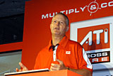 写真中:「PCI Express ×16ビデオカード市場で一番売れているのはATI。2枚差しでも計算上は当然そうなる」とは,ATIの社長兼CEO,Dave Orton氏の弁