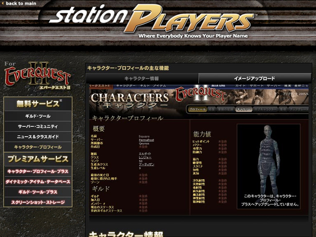 Station Playersとは,EQ2に取り入れられている,ゲームと連動するWeb上のサービス。各クラスでのスペルリストなどの基本情報の提供だけでなく,ギルド用のサイトやフォーラムを設置できたり,キャラクターの情報(装備,スキルなど)をオフゲーム状態で確認したり,ゲーム内でのスクリーンショットをアップロードしたりといったさまざまなサービスが提供されている。基本部分は,EQ2のプレイヤー全員に提供されているものであり,一部は有料のプレミアムサービスで提供されている。