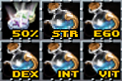 新しく販売されるアイテムは,すでに振り分け済みのステータスポイントなどを初期化し,再度振り分けができるというもの。具体的には,STR,DEX,INTなどの各ステータス用5種類と,スキルポイントを50%だけ初期化できるものの計6種類。各アイテムの価格は以下のとおりだ。