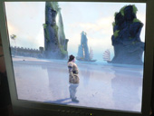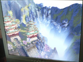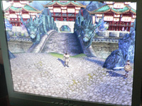 場所を移して海岸(河岸?)は,これまた水墨画に近い,細長い岩の突き立った景色で,沖を行くのは中国式の帆掛け舟"ジャンク"である。そしてプレイヤーキャラクターは,中国の戦国〜三国時代くらいを思わせる,兵馬俑のような鎧をまとい,長髪を後ろで束ねている。まあ,鳥居に似た赤い建造物と,その一つから下がっている釣り鐘にだけは,少々違和感があるけれど。
