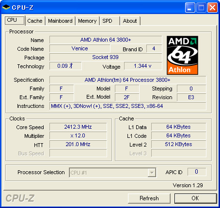 今回比較用に用意したCPUのスペックを,CPU-Z 1.29で確認したもの。左が64 3800+,右が64 3200+である。やはりCPU動作クロックが規定値よりも若干高くなっているが,FSB設定は一様に201.0MHzなので,今回の横並び比較に大きな影響はないと思われる