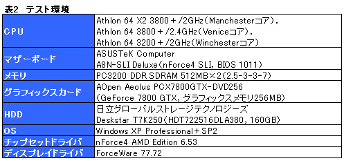 以前,Athlon 64 X2が登場したときに「こちら」で解説したように,2005年夏時点のゲームタイトルにおいては,コア数の多寡より,動作クロックの高低のほうが体感速度に影響する。このため,X2 3800+が不利なのは容易に想像がつくので,今回は「どの程度不利なのか」に注目して見ていってほしい。 なお,テスト環境は表2のとおりだ。64 3800+はVeniceコア版を用意できたので,純粋にコアの数と動作クロックで比較できるのだが,機材調達の都合上,64 3200+はVeniceコアの一世代前となる,Winchesterコアを採用したものである。全体的に,Winchesterコアを採用するAthlon 64 3200+(以下64 3200+)のスコアは低めに出ると思われるので,あらかじめお断りしておく。