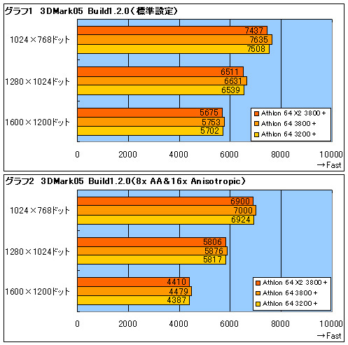 ■ゲームではやはり64 3200+相当 まずは「3DMark05 Build1.2.0」(以下3DMark05)見てみよう。垂直同期と解像度以外の設定をいっさい変更していない状態を本稿では「標準設定」と呼ぶことにし,ForceWareから8倍(8x)のアンチエイリアシング(以下AA)および16倍(16x)の異方性フィルタリング(以下Anisotropic)を適用した状態とで,それぞれグラフ1とグラフ2に分けているが,いずれもほぼ動作クロックどおりの結果。64 3800+と比べて,X2 3800+は標準設定の1024×768ドットで200ポイント近い差を付けられてしまっている。ただし,解像度を上げたり,8x AAと16x Anisotropicを適用したりするとその差がどんどん詰まるのも分かるだろう。これは,解像度が高くなったり,各種フィルタリングが適用されたりすると,GeForce 7800 GTXでもグラフィックスチップがボトルネックになってしまい,CPUの性能差が見えにくくなることを意味する。