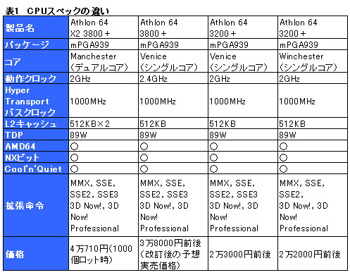 さて,下位モデルの登場によって,一つだけ問題が生じた。それは,シングルコア版のAthlon 64と,モデルナンバーがかぶったことだ。市場にはAthlon 64 3800+/2.4GHz(L2キャッシュ512KB)が流通している。モデルナンバーが同じなら価格も同じ,ならいいのだが,8月2日付けでAthlon 64には価格改定が入る予定になっているようで,事前情報を踏まえると,スペックと価格の関係は表1に挙げるような状態にある。