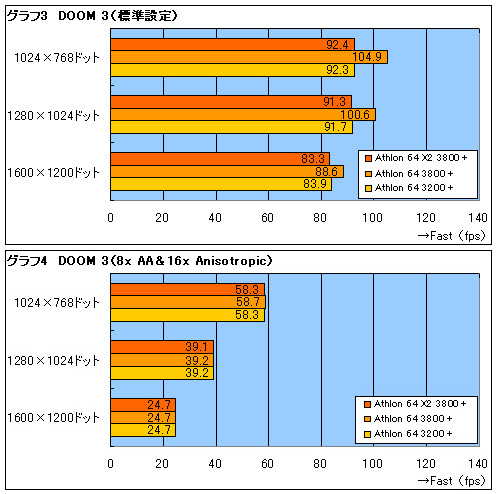 これは実ゲーム系ベンチマークでも同様。「DOOM 3」のTimedemoを用いた平均フレームレートをグラフ3,4にまとめたが,標準状態の1024×768ドットでは,X2 3800+と64 3800+の差は12.5fpsにもなる。それに対して,8x AAと16x Anisotropicを適用すると,グラフィックスカードがボトルネックとなって,CPUによる差はまったく出なくなるのだ。