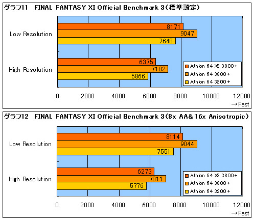 しかし,「FINAL FANTASY XI Official Benchmark 3」(以下FFXI)では少し様相が異なる(グラフ11,12)。64 3800+が優位な点は変わらないものの,X2 3800+が64 3200+に有為な差を付けているのだ。 これは,Athlon 64 FX-57について検証した「こちら」の記事の結果とよく似ている。あのときは,最新世代のSan Diegoコアを搭載するAthlon 64 4000+/2.4GHzが,最も古い世代のClawHammerコアを搭載したAthlon 64 FX-55/2.6GHzよりも,FFXIで高いスコアを出していた。今回も,X2 3800+はManchesterコア,64 3200+はWinchesterコアと異なっており,これがスコアに影響を及ぼしているようだ。