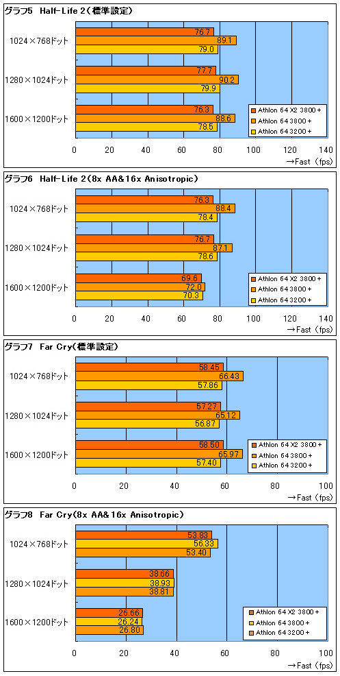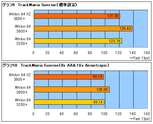 HardwareOCが配布する「Half-Life 2 Benchmark 1.5」を用いて,「Half-Life 2」での平均フレームレートを計測したものがグラフ5,6だ。また,同様にHardwareOCの「Far Cry Benchmark v1.4.1」を用いて計測した「Far Cry」の平均フレームレートがグラフ7,8となる。両者とも64 3800+の優位は揺るがない。とくにHalf-Life 2では,標準状態の1600×1200ドットで64 3800+が12.3fpsという大差を付けている。また,Far Cryの標準設定では,不満のない速度でゲーム画面が描画される目安となる平均60fpsを挟んで,64 3800+が7.47fpsの差を付けている点に注目したい。最新世代のゲームタイトルでは,X2 3800+だとCPUパワーがあと一歩及ばない可能性があることを認識しておくべきだろう。 レースゲームの代表として「TrackMania Sunrise」のベンチ結果も掲載しておきたい。53秒程度で1周する「Paradise Island」というマップのリプレイを,3回連続で実行。その間の平均フレームレートを,1024×768ドットの標準設定で計測した結果がグラフ9,10だ。グラフ3〜8のfpsと同様の傾向になっている。