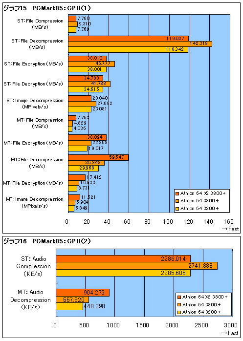 最後に,ゲーム以外の一般的なアプリケーションにおける性能の指標として,PCの総合性能を計測する「PCMark05」の「CPU」ベンチの結果を見てみよう(グラフ15,16)。両グラフの結果を分けたのは,単純に見やすさの問題である。グラフ16に分けたほうの値がほかと比べて大きすぎるためで,他意はない。また,項目名の頭にある「ST」「MT」は,順にシングルスレッドテスト,マルチスレッドテストの意味である。 傾向は明確で,シングルスレッドテストでは64 3800+,マルチスレッドテストではX2 3800+が(程度の差こそあれ)例外なく高い値を示している。これは当然といえば当然の結果だが,ファイルの圧縮や解凍など,マルチスレッドに対応したアプリケーションではX2 3800+のほうが64 3800+よりもパフォーマンスが優れるわけだ。また,シングルスレッドのアプリケーションであっても,同時に複数のアプリケーションを実行する場合は,デュアルコアのAthlon 64 X2 3800+のほうがパフォーマンスが高いことになる。