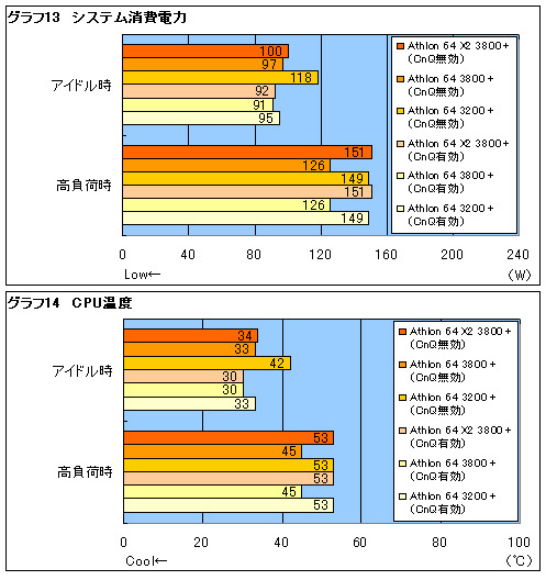 パフォーマンスの検証に続いて,動作時の発熱と消費電力についても確認してみよう。OS起動後,30分間放置した状態をアイドル時,30分間「午後べんち」を実行し続けた状態を高負荷時として,それぞれの状態における消費電力とCPU温度を測定した。消費電力はワットチェッカーでシステム全体の値を,CPU温度はマザーボードに付属するASUSTeK Computer製ハードウェアモニタリングツール「PC Probe」で見ている。このときテスト環境はバラック状態で,PCケースには組み込んでいない。室温は26℃。CPUクーラーはAthlon 64 4000+/2.4GHz用のAMDリファレンスを使用している。 結果はグラフ13,14のとおりだ。省電力機能であるCool'n'Quiet(以下CnQ)の有効/無効に関わらず,高負荷時だとX2 3800+の消費電力は64 3800+より25W大きい。これはデュアルコアによる増加分と見ていいだろう。しかし,それでも64 3200+と近い値でもあり,デュアルコアといっても,消費電力の増加はかなり抑えられている。 CnQを有効にすると,アイドル時には動作クロックが1GHzまで低減するため,そのときの消費電力は92Wとかなり低い。とくに64 3200+の値95Wをさらに下回っている点は特筆に値し,ManchesterコアはWinchesterコアよりもさらに低消費電力化を果たしたCPUコアであるといえる。 これはCPU温度でも顕著に現れており,CnQを有効にすると,X2 3800+はアイドル時に30度と,64 3200+の33度を下回っている。高負荷時でも53℃とCPU温度は十分に低く,消費電力やCPU温度に関しては非常に優秀だ。