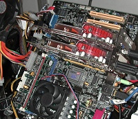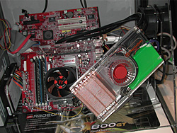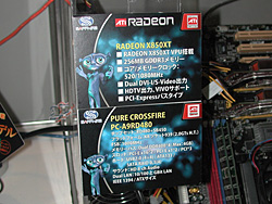 デュアルグラフィックスカードを搭載するシステムはSapphire Technology製。製品名未定のRadeon X850 XT CrossFire Edition搭載マスターカードと,既存のRadeon X850 XT搭載カード,そしてRadeon Xpress 200 CrossFire Edition(RD480+SB450)搭載のAthlon 64用マザーボード「PC-A9RD480」の構成となっていた。 ただし,「ドライバの完成度はまだまだ」(アスク 鷲見和洋氏)だそうだ。CrossFireでパフォーマンスを見せつけるというのではなく,紹介用のムービーを流すにとどまっている。