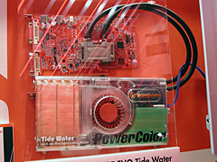 Tulの「PowerColor X800 GT EVO」は,Thermaltake製のグラフィックスチップ用水冷ユニット「Tide Water」を採用する"水冷グラフィックスカード"だ。Tide Waterは2スロットを占有するので,同製品を利用するには3スロット使ってしまうわけだが,公称騒音レベルは最高でも19dBAとのことなので,静音性を重視するならアリかもしれない。 8ピクセルパイプラインのRadeon X800 GTを搭載し,コアクロックは540MHz,メモリクロックは1.18GHz(590MHz DDR)。価格は未定ながら,9月末から10月上旬にかけて出荷される予定だ。