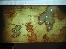 しばしの休憩のあとは,クイズ大会に。所属国ごとに分かれてチーム対戦となった。事前登録ではアルビオン10名,ヒベルニア11名,ミッドガルド7名ということだったのだが,蓋を開けてみるとミッドガルドが大増殖しており,20名近い集団となっていた。 クイズは,スクリーンにDAoCのマップが表示され,各国が領土を広げていくというRvR風の構成。侵略を受けた国は防衛問題を出題され,正解なら防衛,間違えると領土を取られてしまう。もちろん,問題はDAoCのゲームに関するもので, 「この声はなんの音?」 「ギャ〜オゥ」 「メデューサ!」 「残念!」 「ゴーゴン?」 「正解! 実はサウンドファイル違うんですよね」