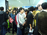 Hakkyu氏の講演前の列。「立ち見でもいいから入れて」という交渉をしている列だ。最後は諦めてホイホイ入れていた係員であった