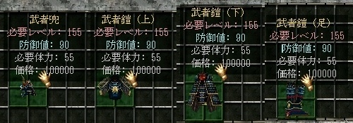 武者鎧(上) 必要レベル:155 必要体力:55 防御値:90 価格:100000 ※全種族装備可 ※エメラルドによる強化可
