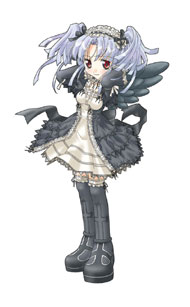 ○「黒衣の天使」 「黒衣の天使」は「墮天使」をモチーフにデザインされ、最初は口数が少なく 冷たいイメージを受けますが、忠誠を誓った主人に対しては忠実です。 キャラクターレベル10以上で装備できる、初級キャラクター向けのペット です。
