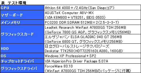 とはいえ,テストしてみると,「3DMark05 Build 1.2.0」や「Quake 4」においては,NVIDIAが予告していたものに比較的近いスコアが出ている。そこで,来週以降に改めて正式なテストを行う前提で,「あくまでも参考程度」とお断りしつつ,AGP版のGeForce 6800 GT搭載グラフィックスカードと比較した,現時点での結果を,速報としてひとまずお届けする。 こういった状況のため,スコアについて詳しくは見ていかないが,システム全体の消費電力やグラフィックスチップの温度など,それなりに価値のあるデータも出ているので,チェックしてみていただければ幸いだ。 なお,テスト環境は表のとおり。明らかにスコアがおかしいと判断したベンチマークに関しては,グラフタイトルを赤字にした。またテスト条件は,本誌で普段行っているものとまったく同一である。(佐々山薫郁,テスト協力:宮崎真一)