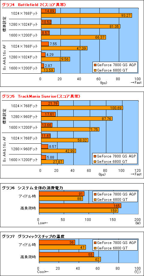 今回4Gamerでは,Leadtek Research製のGeForce 7800 GS AGP搭載グラフィックスカード「WinFast A7800GS TDH 256MB」を評価用に入手している。 だから,その付属ドライバを用いればいい……という流れになればよかったのだが,NVIDIAからカードメーカー各社に配布され,WinFast A7800GS TDH 256MBのパッケージに付属することとなったドライバ「ForceWare 83.10」は,残念ながらかなりのバグ含み。以下に挙げるグラフを見れば一目瞭然なのだが,一部のテストにおいて,尋常ではなく低いスコアが出てしまっている。とくに「TrackMania Sunrise」では,オンラインゲームにおけるラグのような現象まで生じており,このドライバを評価に利用するのは無理だ。前述のとおり,すでに搭載グラフィックスカードが出荷されている製品だが,NVIDIAが公式に対応ドライバを提供していない現時点では,このような問題があることを,十分に認識しておくべきだろう。