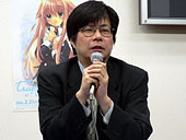 発表会では,最初にブロッコリー 代表取締役会長兼最高開発責任者 木谷高明氏と,サーカスの“tororo団長”こと松村和俊会長が登場し,挨拶に続いて開発秘話を披露した。 木谷氏は「うちで展開している作品には,お笑いはあったけれど,本道を行く恋愛ゲームがなかった。お店(注:「ゲーマーズ」各店舗のこと)では売れているのに。その意味で,憧れていたギャルゲーが発表できてたいへん嬉しい」と語り,松村氏は「ゲームの設定期間は高校3年生の10月から半年間。人生でいちばん切ない時期を選んでいます。楽しいこともあるから,悲しみも深くなるといった,奥深い展開を描いていきたいと思います」と述べ,それぞれに感慨と意気込みを示した。 それに続いて,開発企画のための合宿は群馬県の伊香保温泉で2年前に行われ,二日間でほぼ作品のアウトラインを描くところまでもっていったこと,温泉宿に留めていた木谷氏の愛車に旅館の職員が車をぶつけて壊し,木谷氏としては「本当に涙が出た」ことなど,作品のモチーフと微妙にオーバーラップする感じの“オヤジトーク”で,制作にまつわるエピソードが語られた。 また,木谷氏の「いま現に学生である人が,学園恋愛アドベンチャーを買うのが奇妙に思えたけれど,よく考えてみれば自分も学生時代に,集英社のコバルト文庫とかを読んでいた。そういう感覚なのかもしれない」という発言は,作品の性格と木谷氏のパーソナリティ,両方が窺えてなかなか興味深かった。