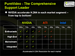 NVIDIAが示した,1080p/720p/480ppの各解像度における高解像度ビデオ再生支援対応状況。「Enthusiast」「High-End」「Mainstream」「Integrated」は順に「ハイエンド」「ミドルレンジ」「ローエンド(バリュー)」「オンボードグラフィックス」と読み替えてほしい