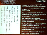 右:これが,ギャリオット氏が制作したというEloh文字。縦読みの象形文字で,左のほうから右欄の英語文に対応している。家が一つなら「家」,二つなら「国家・文明」など。あなたは解読できるだろうか?