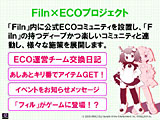 ステージには運営元ハイビジョンの代表取締役社長 宮脇元康氏が登場し,Filnのコンセプトについて説明した。ゲーム,アニメ,同人誌といった“アキバ系”の話題を,周囲の目を気にすることなくやり取りできるのが特化したSNSのメリットであり,Filnの会員数は現在,1万5千人を数えるという。なお,Filn上での展開予定については既報のとおり,「ECO運営チーム交換日記」の掲載や,マスコットキャラクター「フィル」のゲームへの実装が予定されている。