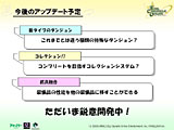 また「サザエさんの波平さんの頭みたいな,ネタ装備は実装されないのか」という質問には,同じく岩田氏が「現在はそれよりも,一般的な装備品やカジュアルな服装の要望が多いので,そちらに努力しています。ただし,それだけでは面白くないので,別途企画を立て,アイテムチケットの形でいろいろなものを導入しています。そちらで,面白いものを取り入れていけたらいいなと,考えています。今後にご期待ください」と答えた。