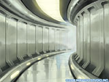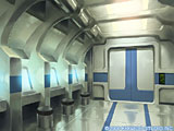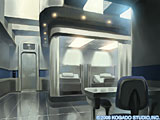 第190広報部隊が乗り組む母船「デルフィス」の艦内各部。上段左から廊下,展望室,食堂。下段左から作戦室,医務室,艦橋