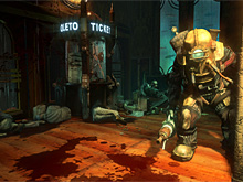 海底都市Raptureはユートピアで,時代設定は個人レベルのDNA操作が可能になった近未来。アールデコ風のインテリアで覆われている優雅な雰囲気とは裏腹に,Raptureの住人達は注射一本で安易な人体改造を行うという異様な世界である。 ただ,デモの説明を行ったIrrational GamesのHogart De La Plant(ホガート・デラプラント)氏によると,このRaptureではゲーム開始直前に大異変が起こったらしく,床は水浸しになっており,内装や家具は破壊され尽くされている。さらに,繁華街には多くの死体が横たわっており,悪夢のような出来事が,つい先ほど起こったことがうかがえる。