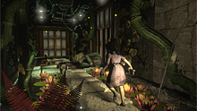 De La Plant氏の操作するキャラクターがピストルを取り出すと,Little Sisterは怯えてBig Daddyの背後に回り,Big Daddyは雄叫びを上げて威嚇してきた。Big Daddyは強力なサブマシンガンを手にしているが,危害を加えない限り,プレイヤーに襲いかかってはこないようだ。 奇妙なのは,周囲が安全だと確認できると,Little Sisterは注射器のようなもので死体から何か液体を取り出し,それを飲むという行動をしたこと。この液体は「Plasmid」(プラスミッド)と呼ばれているので,遺伝子に何らかのブーストを起こす薬品(遺伝子サンプル?)のようだ。PlasmidはBioshockの世界で金銭のような交換価値を持っていて,少女は体内に貯めて運搬しているという。
