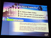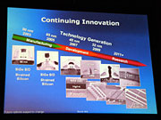 「(このように大きな市場シェアを獲得するに至った)我々の勝因は二つある。一つはマイクロアーキテクチャの進化を積極的に図るという姿勢。もう一つは,先進プロセスルールの早期導入と実用化だ」(Chandrasekher氏) マイクロアーキテクチャについては,Pentium Proで進化を急ぎすぎて結果的に失敗したこともあったが,プロセスルールで常に業界の先導役を担ってきたのは事実。Intelは最新の65nm世代,300mmウェハで5ラインを稼働させており,さらに45nmファブ(製造施設)を2ライン建設中と報告し,進化に対するアグレッシブさが,まったく衰えていない点を強調する。