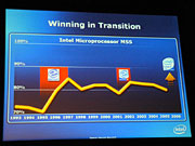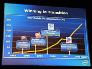 Chandrasekher氏は,1983年から2006年までの,市場におけるCPUシェアの推移をグラフで示した。このスライドからは,Athlon 64でAMDが勢力を伸ばしてきた2002年以降,Intelが若干シェアを減らしているのが読み取れるが,同氏は「シェアに多少の増減はあるものの,おおむね80%を超え,勢いを保っている」と述べる。AMDの健闘など,Intelからすれば「『多少の増減』の範疇」だと言っているわけだ。