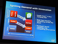またマーケティング面においては,「Intel史上これまでにない速さ」(Chandrasekher氏)で,Core 2 Duo&Intel 965 Expressのセットを浸透させていくとのこと。Intelは,2006年第2四半期の時点で,Pentium Dを「パフォーマンス/メインストリーム」,Pentium 4を「レガシークラス」(過去のメインストリーム,といった意味)と位置づけている。ローエンドとなる「バリュークラス」にCeleron Dだ。 さらに,CoreマイクロアーキテクチャのCPUが出揃い,Core 2 Duoがパフォーマンス/メインストリームクラスとなる2006年後半には,レガシークラスにPentium Dが位置づけられ,バリュークラスは,Pentium 4とCeleronの二段構えとなる戦略が明らかになった。