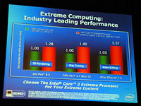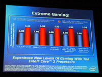 では,肝心のPCゲームにおいてCore 2 Duoの性能はいかばかりなのだろうか。 Chandrasekher氏は,Pentium世代の最上位モデルとなるPentium Extreme Edition 965/3.73GHz(L2キャッシュ2MB×2,FSB 1066MHz)と,Core 2 Duo E6700/2.66GHz(L2キャッシュ4MB,FSB 1066MHz)を用意し,ほかの環境をすべて同一にしてベンチマークテストを行った結果として,左上のスライドを提示した。ただCPUが変わっただけで,「Quake 4」(マルチスレッド最適化のバージョン1.2適用済み)で1.5倍,「F.E.A.R.」(バージョン1.04パッチ適用済み)で1.45倍,「Half-Life 2: Lost Coast」(Build 2707)で1.56倍などといったように,かなりのスコア向上が見られる。Pentium Extreme Editionと比べて,動作クロックで1GHz以上低いCore 2 Duoの命令実行効率が,いかに高いか窺い知れよう。