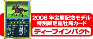 イベント詳細 ○第1弾 2006年宝塚記念モデル「ディープインパクト」種牡馬カード登場! [期間] 6月23日(金)15:00〜6月30日(金)15:00まで