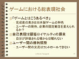 といった施策が必要になるだろうと主張した。実例として挙げられたのは,ガンホーゲームズと,米Microsoftがゲーム内広告配信企業を買収した件などだ。また,広告手法として「ポケモンだいすきクラブ夏休み大作戦!2004」などで展開された,提携企業サイトをオリエンテーリング形式で順に訪問させる企画を題材に,広告を見ることが一種の「労働」となっていくという見解を示した。 また,総表現社会というキーワードをめぐっては,アバターのパーソナライズや,MOD開発への参加,コミュニティにおける交流,「Second Life」におけるプレイヤー著作物など,大枠でいえば想像がつく範囲の話題に留まった。ただし,「プレイヤーが求めるのは,自分が評価される場」であり,「自己表現こそが顧客ロイヤルティの源泉になる」という指摘や,「ユーザー間の交流は本質的にコントロールできず,権利調整が課題になる」といった論点提示は,現在のオンラインゲーム界を眺めたとき,なかなかよくまとまった批評であるように思われる。 そのほか,Wikiなどに見られる「他人の存在が自分にとってのメリットとなる構図」をゲームに応用できないか,オンラインゲームを療養や社会訓練に用いられないか,キャストプレイヤーという形で雇用の拡大につなげられないか,など,ゲームが発揮し得る潜在的な可能性をいくつか指摘して,講演を終えた。