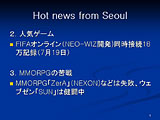 次いで,話題の焦点はゲームの開発から,ゲームを受容する社会側へと移る。オンラインゲームが持つ可能性を,教育,医療,ニュース&ポータル,コミュニティ,放送という,五つの面から分析する魏氏は,「君主」の中で提供されているゲーム内放送局などを例に挙げつつ,韓国での取り組みを挙げていく。 会場のプロジェクタで実際に映像を示しつつ,氏は君主の韓国サービスで,ゲーム内ニュース番組が有志の手によって実際に機能していることを説明した。キャスターを務めているのは放送業界の経験を持つ人であるが,ゲーム内での立場はあくまで一プレイヤーである。ちなみに韓国では,制度上ゲーム内で放送事業を行うことは禁じられているそうだが,ゲーム内の話題に特化した内容であれば,そこには足を取られないらしい。 また,2万人の市民記者によって記事が書かれるWeb新聞「オーマイニュース」の隆盛と,紙の新聞の衰退,さらに1人で映像をインターネット発信できるサービス「Afreeca」で,ワールドカップのテレビを映しつつ,オリジナルの解説を配信する人の人気ぶり(テレビ映像を配信することが権利上問題視されてからは,解説のみを配信し,音声を消したテレビを見ながら楽しむ形に変容していったらしい)にも触れ,そうしたいわばWeb2.0的な取り組みが,成功を示しつつある現状を,オンラインゲームと絡めて解説していった。 そして,この点から日本が憂慮すべきは,若い世代の「オンライン・トレーニング」の欠如であり,携帯電話などによる比較的狭いコミュニティ体験が,来たるべき「Global Virtual Society」のなかでの孤立を招く危険だとした。