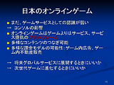 という,三つの論点に沿って説明し,それが日本におけるオンラインゲーム開発にとって,有益な視点になるはずだと指摘した。氏の見るところ,日本のオンラインゲームにとって課題となるのは,