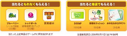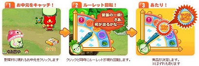 【賞品】 もれなくもらえる・・・「ブルーベリー(シールド機能/3 分間)」、「レッドボール(破壊速度1 秒アップ/5 分間)」、「賞賛値50」 あたりが出たら抽選でもらえる・・・「500MP/100 名」、「野菜村クッション/50 名」、「お中元カタログギフト/20 名」