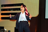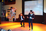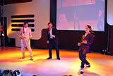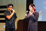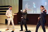 さて,そうしたやや堅めの話題に後は,ガンホーの発表会で恒例となった感のある,社長みずから参加するパフォーマンスタイムだ。今回のサプライズゲストは,「エアギター」(ロックミュージシャンのスタイルを真似て,ギターを持たずに弾いているフリをするパフォーマンス)の金剛地武志氏が登場。さっそくパフォーマンスを披露した後に,ガンホー森下社長と,ジー・モード宮路社長に壇上でエアギターをレクチャー。最後に全員でエアギターの演奏(?)を行って,会場を沸かせた。