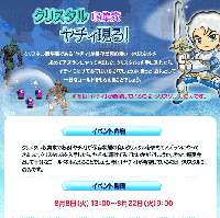 < クリスタル収集家ヤチィ現る! 詳細 > ■イベント内容 クリスタル収集家である「ヤチィ」が保存状態の良いクリスタルを求めてアズランにやってきます。クリスタルを入手したら、ヤチィに届けてあげましょう。きっと、報酬として十分なゴールドをもらえることでしょう。