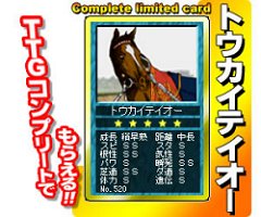 ○新規投入アイテム コンプリート限定Extraカード 『トウカイテイオー』 皇帝シンボリルドルフの子。 デビュー父同様に無敗で二冠達成、三冠ももはや時間の問題かと囁かれた矢先にまさかの骨折。三度にわたる骨折との戦いの最中に親子2代ジャパンC勝利という偉業を果たす。そして、有馬記念勝利と共に引退と、去り際も帝王の貫禄を見せ付けた。
