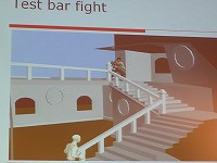と,ここでモリニュー氏はプロトタイプのデモを二つ紹介した。一つは階段で二人の男が襲いかかってくるデモで,階上から迫ってくる敵を素早く弓で射抜いて壁に磔(はりつけ)にし,階下から走ってきた相手は高さを利用して突き落として殺すという内容。もう一つは,酒場のカウンターから押しのけられたことで乱闘が始まる。2人組と主人公の間に割って入ってきた暴漢をカウンターにあったボトルでノックアウトし,続けてフロア中央に移動して椅子やテーブルを相手に投げつけたり,シャンデリアにつかまって相手を蹴り伏せたりという動作を見せた。銃や剣を使っていないこともあり,必ずしも一撃で相手が倒れるわけではなかったが,もはやヒットポイントという概念はなくなっているようだ。