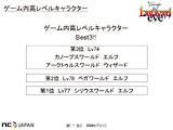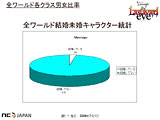 いくつか興味深い部分をピックアップしてみると,まず,ハイレベルプレイヤーのクラス比では,全ワールドともエルフとウィザードが多数を占める。育てやすさと,高レベルになったときの強さを考えれば,これは納得のゆく結果である。 自動的にトップレベルキャラクターベスト3もすべてエルフとウィザードに占められており,第1位はレベル77のエルフ,2位がレベル76のエルフ,3位はレベル74が2名でエルフとウィザードという結果となっていた。比較的新しいワールドの「アルタイル」ですら,今はレベル70以上が10名もいることには大変驚かされた。このほか,過剰精錬された武器の種類とスペック,ゲーム内の結婚率など,なかなか知ることのできない数値が並んだ。 ちなみに結婚しているのは全プレイヤー中わずか3%……。これには解説の笠原氏も「リネージュには結婚によるメリットがほとんどないからでしょうね」と苦笑した。ここはひとつプレイヤー(キャラクター)が結婚したくて仕方がなくなるような美味しいシステムを,ぜひ実装してもらいたいところだ。