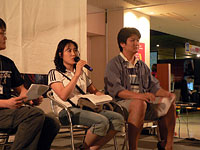 リネージュ国勢調査に続いては,このイベントのために来日した,韓国NC softの開発担当者,キム・キュホ氏およびキム・ジョンミ氏による「リネージュフリートーク」が行われた。キム・キュホ氏はもっぱらゲームコンテンツとゲーム内イベントの企画を手がけ,今回のエピソード5では「影の神殿」の制作を担当した。キムジョンミ氏は海外事業全般,とくに日本市場を担当するほか,アップデートのスケジュール,バグフィックスの担当でもある。